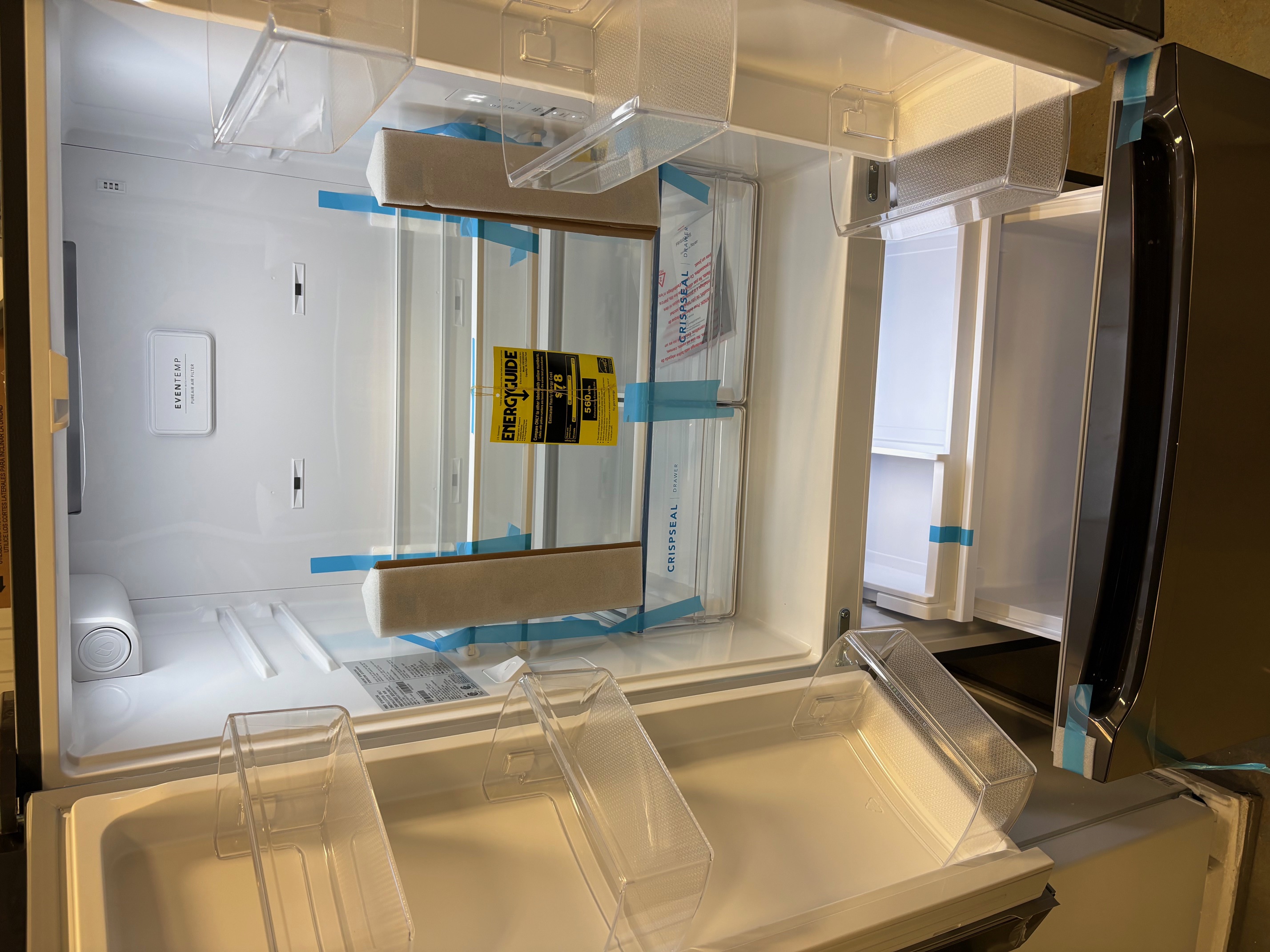 Ce réfrigérateur Frigidaire à deux portes de 83 cm avec distributeur d'eau interne conserve les aliments frais plus longtemps grâce aux bacs à légumes CrispSeal et offre un espace de rangement pour chaque chose grâce au système de rangement modulable.Éclairage à DEL brillant